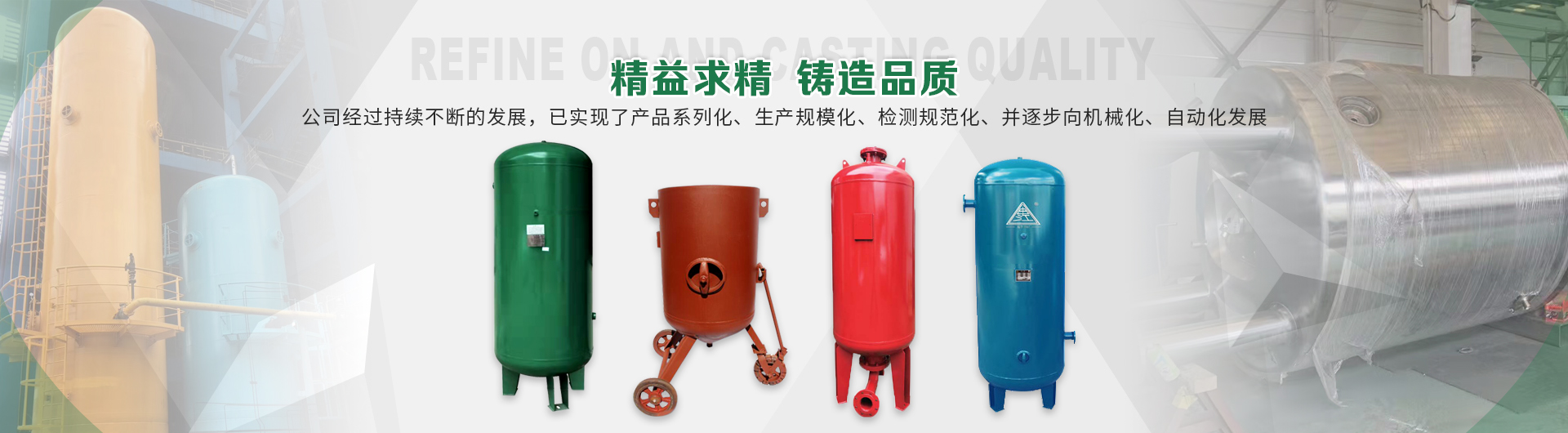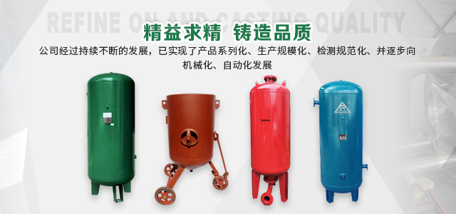 本企業(yè)產(chǎn)品有眾多產(chǎn)品分類,儲氣罐、磨料桶、碳鋼儲氣罐、不銹鋼儲氣罐、中高壓儲氣罐、臥式儲氣罐、緩沖罐、隔膜罐、噴砂罐、分氣缸、以及其他的定做非標產(chǎn)品等,產(chǎn)品廣泛應用于化工、制藥、橡膠、石油、食品、機械等行業(yè)。